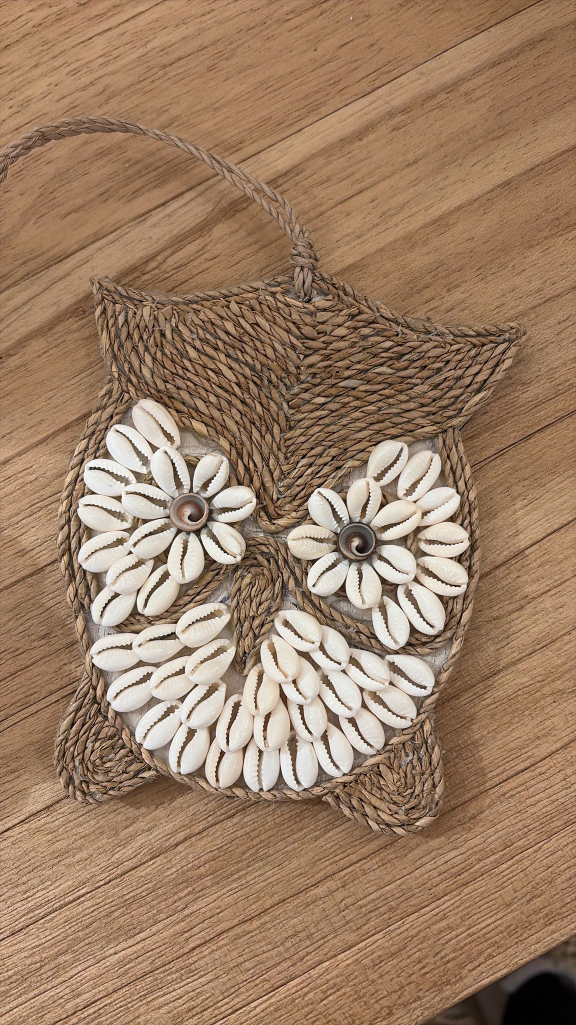Suspendue au mur ou posée sur un meuble, cette jolie chouette apportera une touche exotique dans votre intérieur. Cet objet est entièrement réalisé à la main à Bali et recouvert de coquillages.